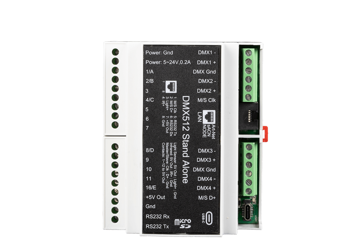 The ultimate DIN-mounted DMX controller, LIGHT-UP DIN Pro, transforms lighting control. This powerful device, which offers a robust Stand Alone mode and a variety of trigger options including RS232, Contacts, Clock, NODE x4 ports, and Master/Slave on LAN, is ideal for architectural installations and major integration projects.